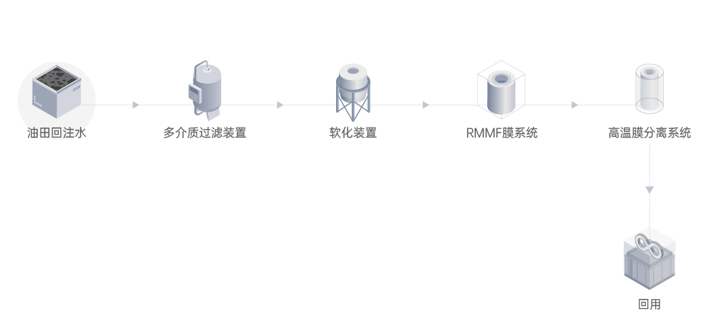 石油開采過程中會使用水蒸汽對油田注汽,使原油升溫便于開采,冷卻后的水蒸汽成為高溫高鹽廢水。該廢水產出量大、雜質多、難處理,如果直接排放會損失大量熱源和水資源,且水中污染物較多,對環境危害較大。油田回注水溫度一般高于80℃,根據含油污水水質特點,需要去除水中的懸浮物、石油類物質、硬度及硅等雜質,保證處理后的回注水滿足回用要求。萊特萊德合理設計預處理工藝,廢液經過隔油、破乳、絮凝沉淀等處理后,經由軟化和吸附處理后進入高溫膜系統。預處理有效保證高溫膜系統長周期穩定運行,經過高溫膜系統處理后的油田回注水可滿足回用要求。