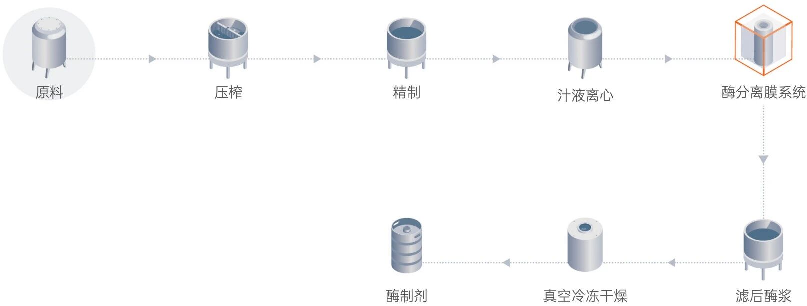 酶是一類極為重要的生物催化劑,化學本質是蛋白質或RNA,按照酶的化學組成可將酶分為單純酶和結合酶兩類。傳統生產工藝是發酵、絮凝沉淀、過濾、溶劑萃取、真空蒸發、干燥等,其生產過程能耗高、酶失活率高、收率低。萊特萊德采用特種酶分離膜系統對酶混合液進行精制處理,將酶從酶混合液中分離出來。解決了高溫制備酶制劑導致酶失活的問題。