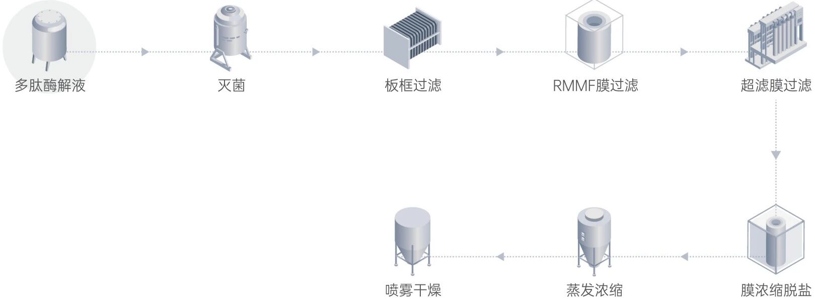 萊特萊德采用先進技術,利用膜產品對肽進行提純,經預處理過后的酶解液,通過特種分離膜系統對肽中的顏色及鹽分進行脫除。最終在低溫下實現了多肽的凈化及提純。