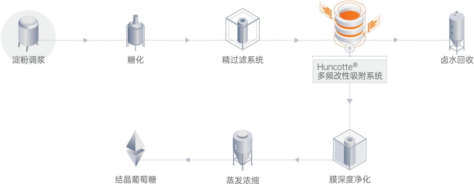 淀粉糖提取工藝中包含固液過濾分離、糖脫鹽、糖脫色、深度純化、鹽回收等。萊特萊德膜分離工藝包可用于淀粉糖的精過濾、離子交換脫鹽、膜產品純化、糖脫色等工藝段。獨特的鹵水回收工藝包可將鹽與糖、有機物等其他雜質進行分離,回收純凈的鹽用于生產。實現了產品質量好,且生產成本低,并已逐步取代傳統工藝。